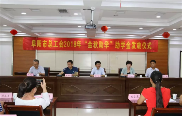 为精心实施精准帮扶困难职工子女高校就学和毕业生就业创业,8月31日,阜阳市总工会举行2018年“金秋助学”助学金发放仪式,深入开展金秋助学、“圆梦计划”、和“金牌蓝领计划”活动。来自五个县、市、区的基层单位代表、受助学生代表、受助家长代表参加了仪式。市总工会党组书记、副主席房继红主持会议。市政协副主席、市总工会主席李进出席仪式讲话。