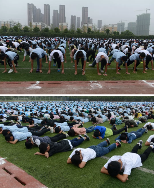 疏散到操场上的三中师生做起了对核武器杀伤破坏因素的防护动作,学生按要求趴伏在操场进行“避险”。