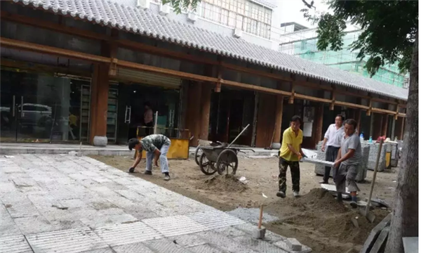 记者在施工现场看到,在文峰宾馆与市图书馆之间的纯商铺街区,人行道全部铺上了手凿天青石地面;所有木结构建筑上漆全部采取手工刷漆的方式多遍涂抹,通体棕黑色的木结构也显得大气而沉稳。