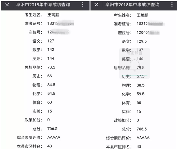 神同步!阜阳双胞胎姐妹,中考分数也是双胞胎…