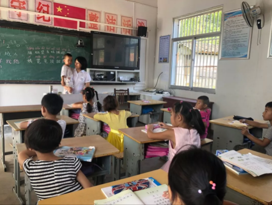 相信很多人看到下面这张照片会很疑惑,为何老师会抱着孩子上课?其实这位老师抱的是班里的学生,今年刚上幼儿园中班,因为这个学校只有一个老师一个班,这个班总共11个学生,却有幼儿园中班、大班、小学一二三年级