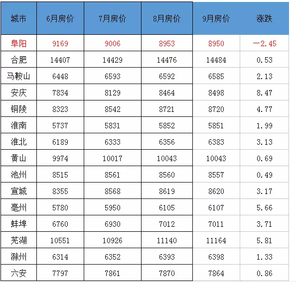 下半年安徽16市的房价数据发现一个让人担心的事情阜阳是唯一房价下跌的城市且连续下跌超过四个月房价下跌219元/㎡跌幅达2.45%阜阳是下半年安徽唯一下跌城市你觉得还能买吗?