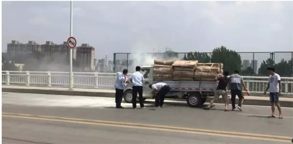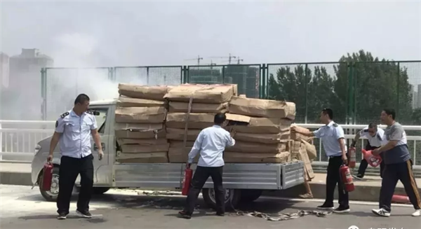 6月10号下午1点30分左右,北京路立交桥上,一辆货车货物突然起火!,货车后方行驶的市民刘红军,赶紧提醒货车司机停下进行扑救,并迅速拿出后备箱的灭火器。一路公交车开到这里,驾驶员范虎也立刻加入救火。“